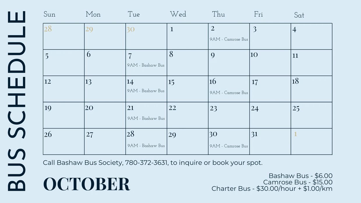The Bashaw Bus Society provides transportation services to members of our community and it's surrounding area.